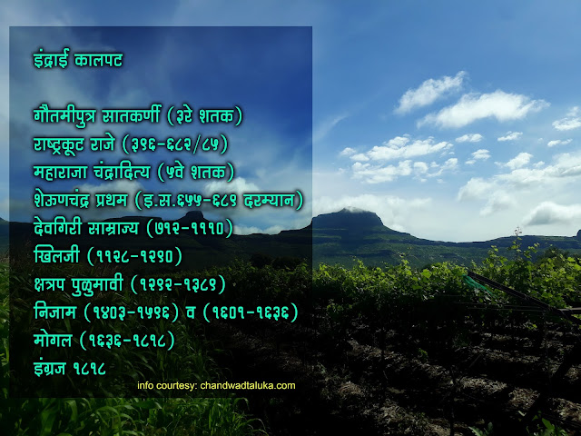 आपल्या अंगाखांद्यावर असंख्य कातळ कोरीव भग्नावशेष बाळगून असलेला इंद्राई हा राजधानीचा किल्ला होता. एका महत्वाच्या घाटावरचा पण मुख्य मार्गापासून काहीसा आत. याच्या पश्चिम बाजूला भावडबारीचा घाट तर पूर्व बाजूस राहूड घाट. जुन्या काळापासून या घटांनी मोठी वर्दळ अनूभवली आहे. इंद्राई किल्ल्यावरची जुनी बांधकामे आणि कातळातले भग्नावशेष एक दोन भेटीत पाहून होत नाहीत.